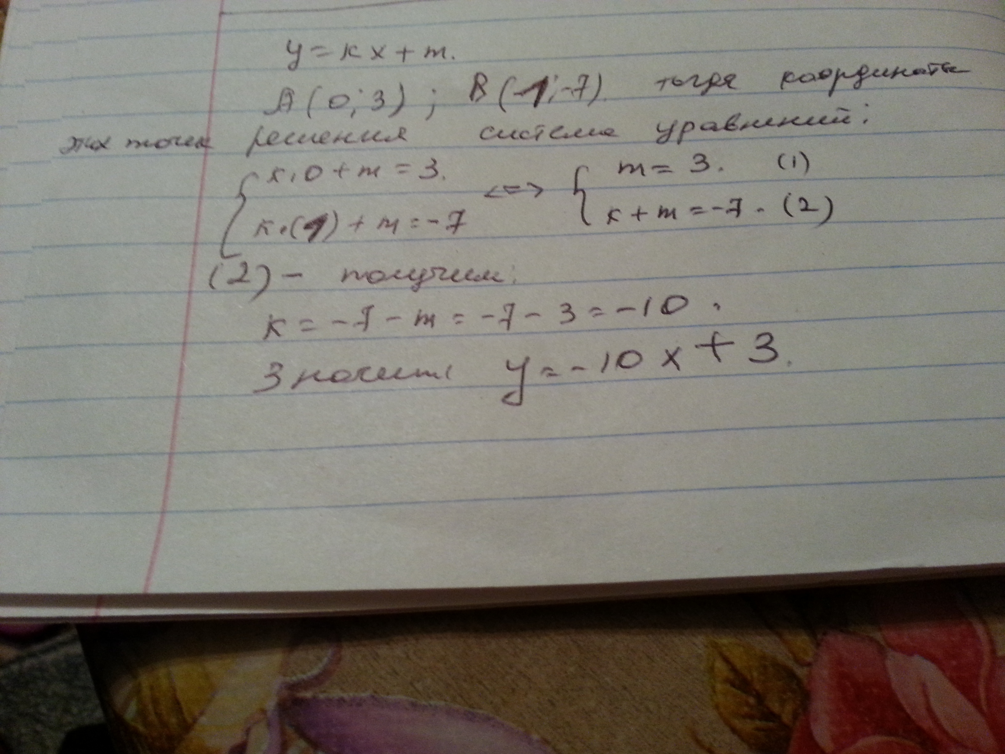 подставляем значения и составляем систему: 3=m и -7=k+m; -7=k+3; k=-10; Ответ: y=-10x+3