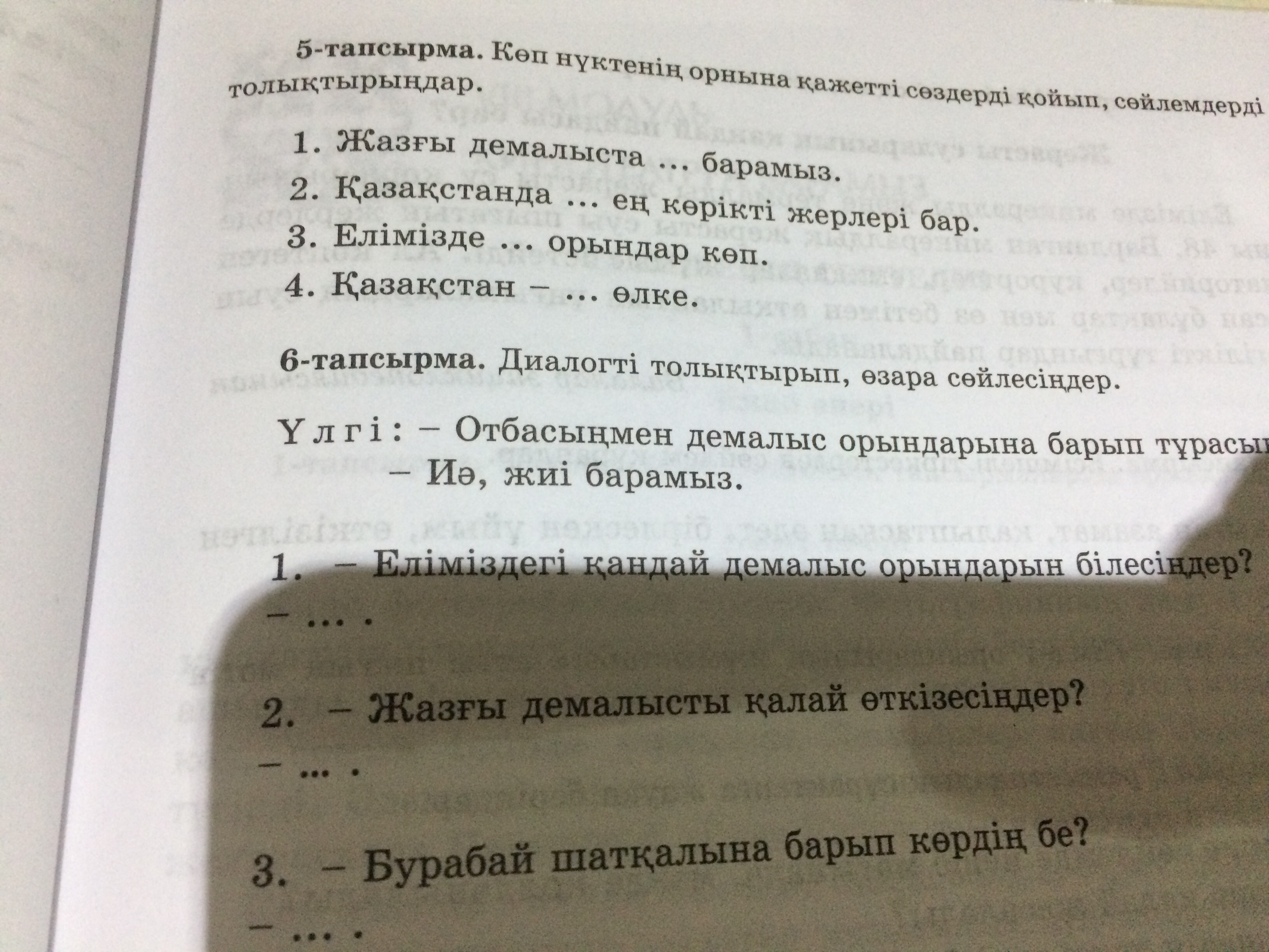 1. бурабайда өткіздім. 2жаз мезгілі. 3 күзді ұнатады 4.Алакөлге барып қайтты 5,медеуге бардық 6.шипажайға барады