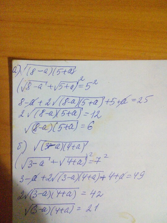 б)найдите велечину корень((3-a)(4+a)), если корень(3-a) + корень(4+a) = 7