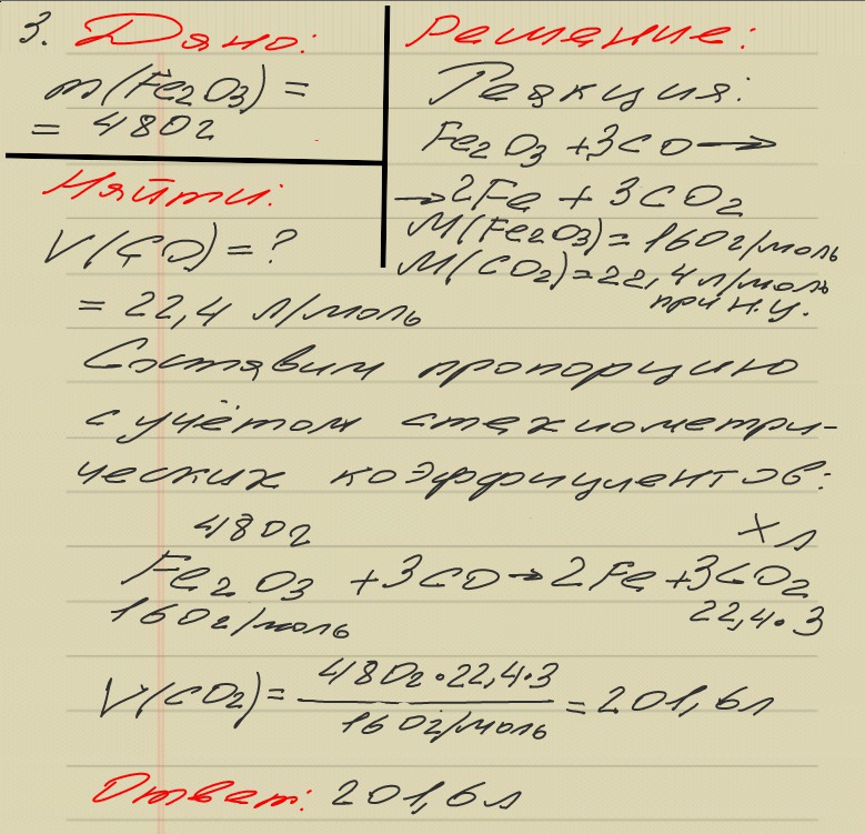 3. Прореагировало 480 г OFe3 и угарный газ. Найти объём углекислого газа.