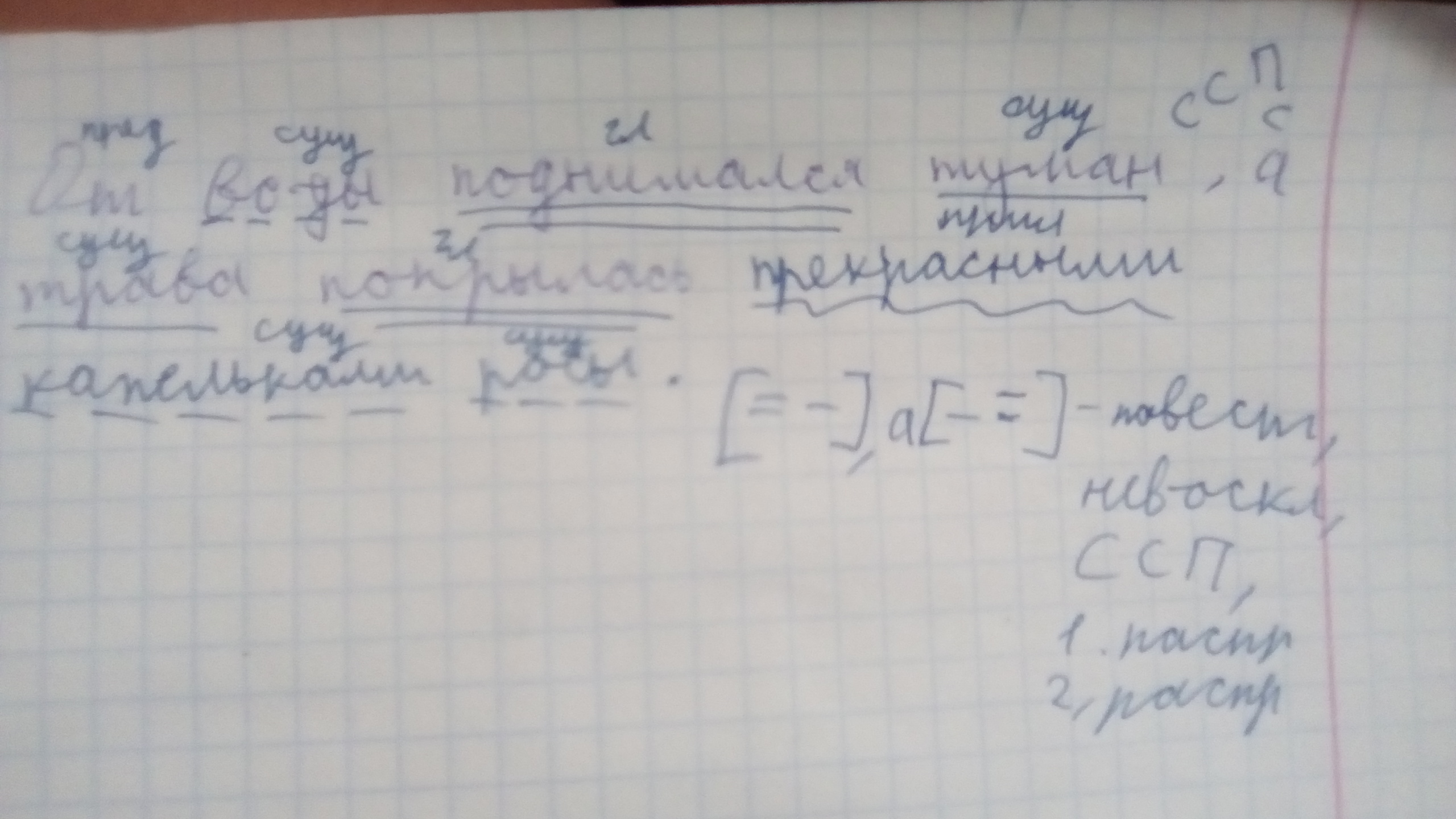 синтаксический разбор предложения. От воды поднимался туман,а трава покрылась прекрасными капельками росы