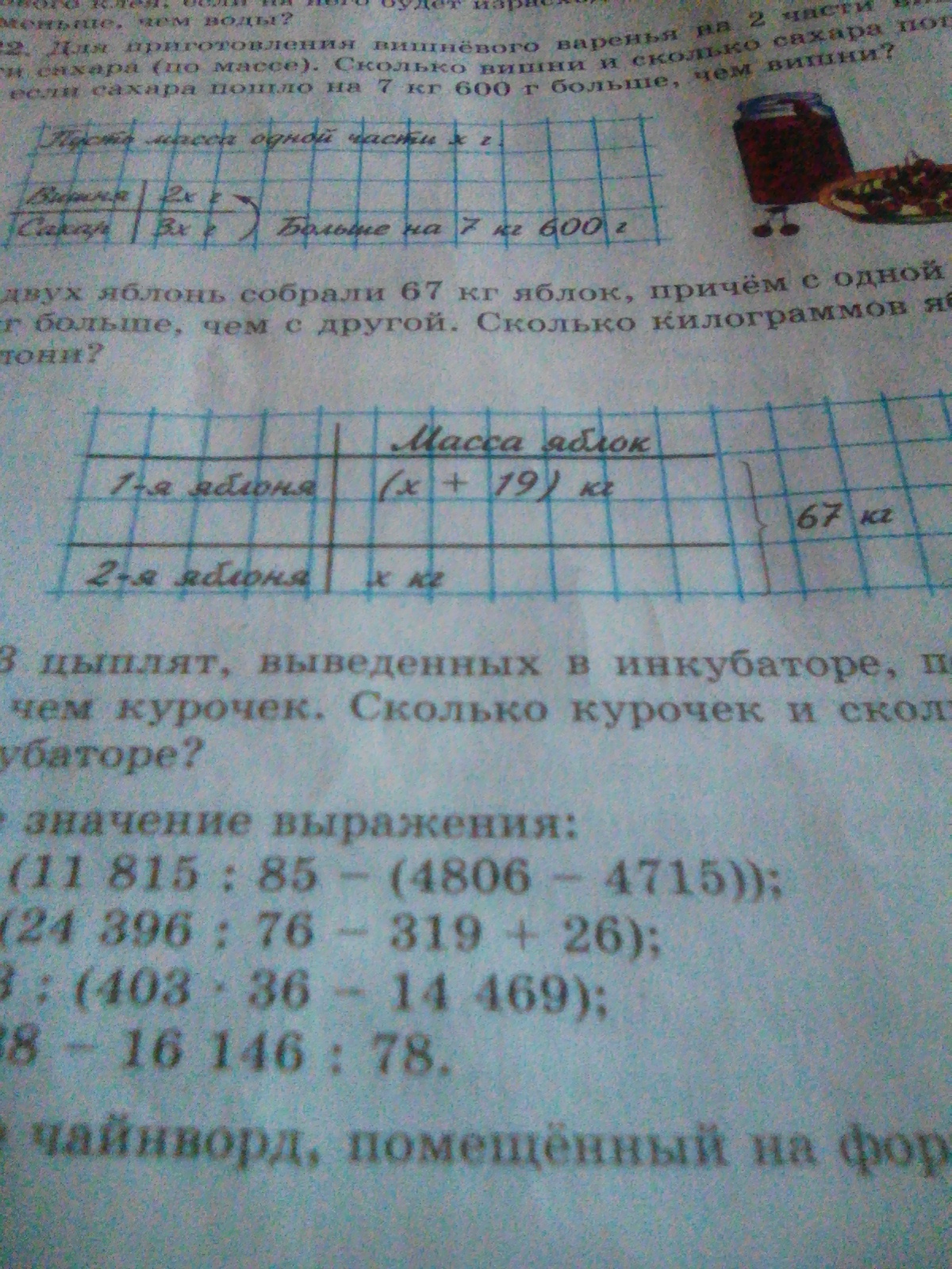 Помогите решить задачу!!!!!!! С двух яблонь собрали 67 кг яблок, причем с одной яблони собрали на 19 кг больше , чем с другой. Сколько килограммов яблок собрали с каждой яблони? Надо решить например так Пусть маса одной части х кг потом например как на картинке потом написать масса 1-ой яблони 19 х на 2-ой яблони х кг и уровнения
