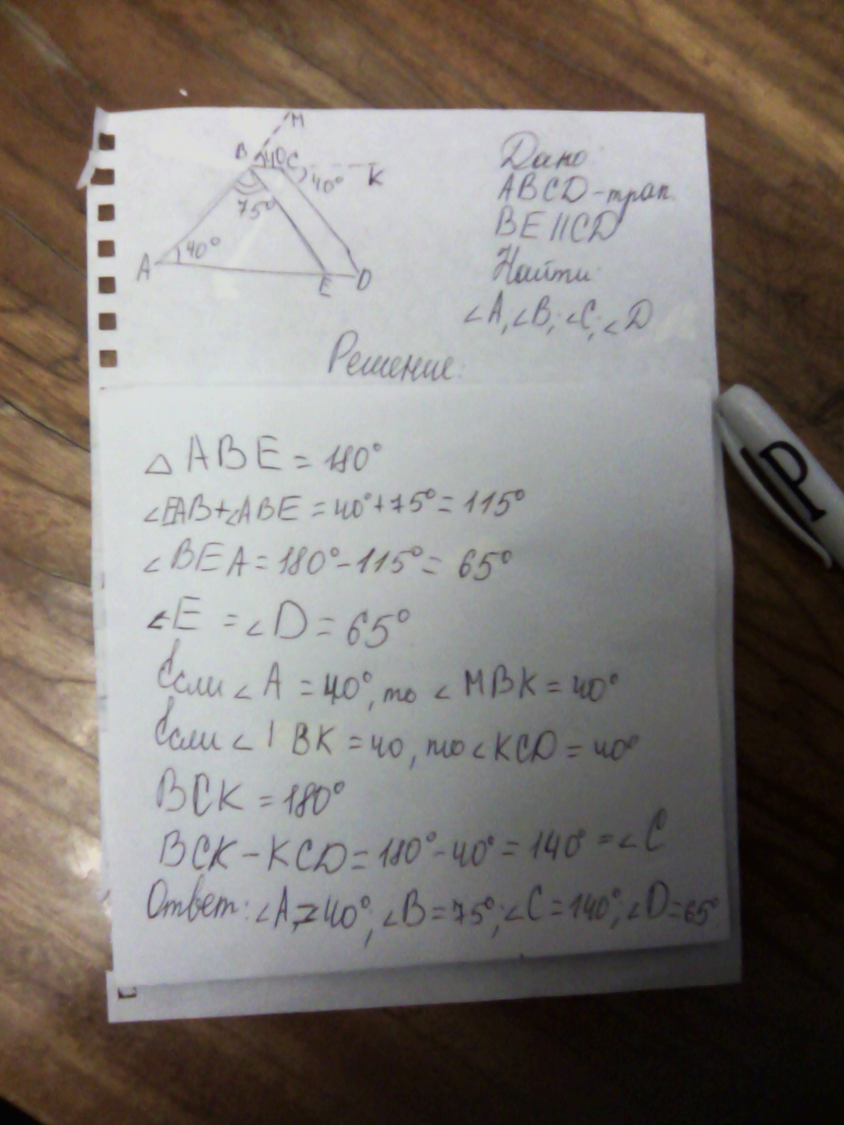 А = 40°, В = 75°, С = 140°, D = 65°