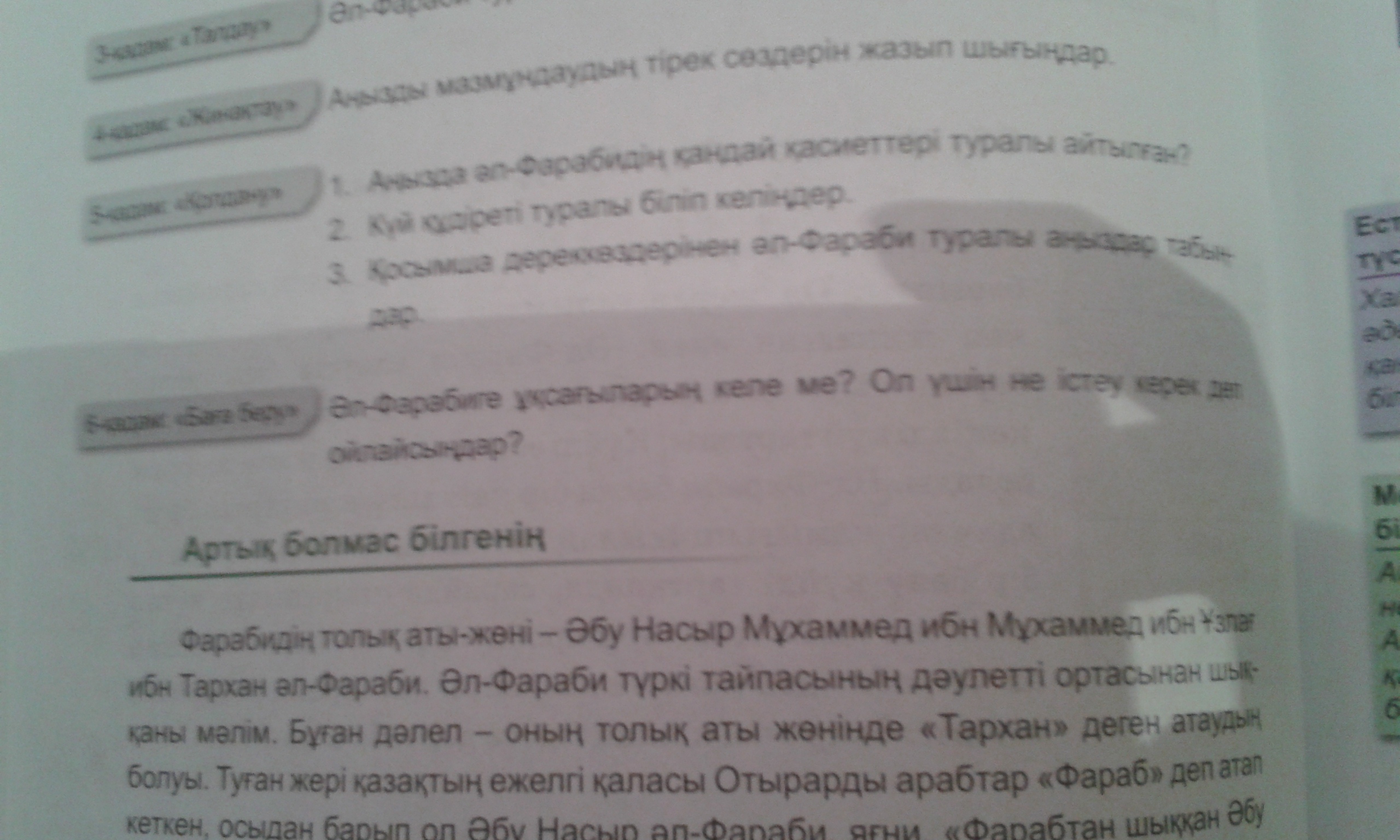 ия əрине ол казак халқына коп енбейгін сіңірген .Əл Фараби сиякты болу ушин коп кітап окып, көп ізденуіміз қажет
