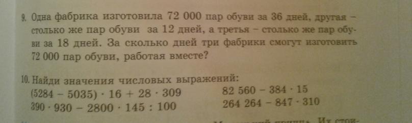 Одна фабрика изготовила 72000 пар обуви за 36 дней другая столько же пар обуви за 12 дней а третья столько же пар обуви за 18 дней .За сколько дней три фабрики смогут изготовить 72000 пар обуви работая вместе 2) (5284-5035)*6+28*309 390*930-2800*145/100 82560-384*310 264264-847*310