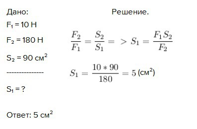 Если на малый поршень гидравлического пресса действия сила 10H, то на большом поршне получаем 180H.Чемну равна площадь малого поршня, если площадь большого поршня 90см2