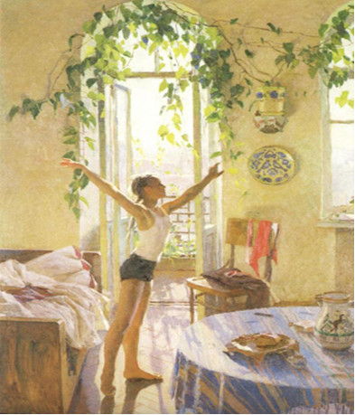 В центре картины мы видим девочку, обрадовавшись прекрасной погодой за окном, она с отличным настроением встречает новый день, чтобы окончательно проснуться она начинает утро с зарядки. На ее лице видна улыбка, ее золотистые волосы хорошо освещаются теплыми лучами солнца и блестят. По фигуре девушки хорошо видно, что она занимается спортом, наверное, танцами, она стоит в классической танцевальной позе. Она даже спит не в пижаме, а в черных шортах и белой майке. Ее руки подняты вверх и разведены в стороны, одна нога стоит на носочке, вся она подтянута и тянется вверх. Она как птичка, кажется, вот-вот вспорхнет и полетит навстречу новому дню.