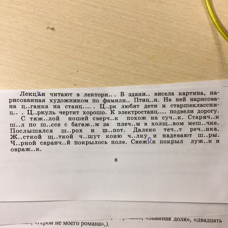 Лекции читают в лектории. В здании висела картина, нарисованная художником по фамилии Птицын. На ней нарисована цыганка на станции. Цирк любят дети и старшеклассницы. Циркуль чертит хорошо. К электростанции подвели дорогу.С тяжелой ношей сверчок похож на сучок. Старичок шел по шоссе с багажом за плечом в холщовом мешочке. Послышался шорох и шепот. Далеко течет речонка. Жесткой щеткой чешут коню челку и надевают шоры. Черной саранчой покрылось поле. Снежок покрыл лужок и овражек.