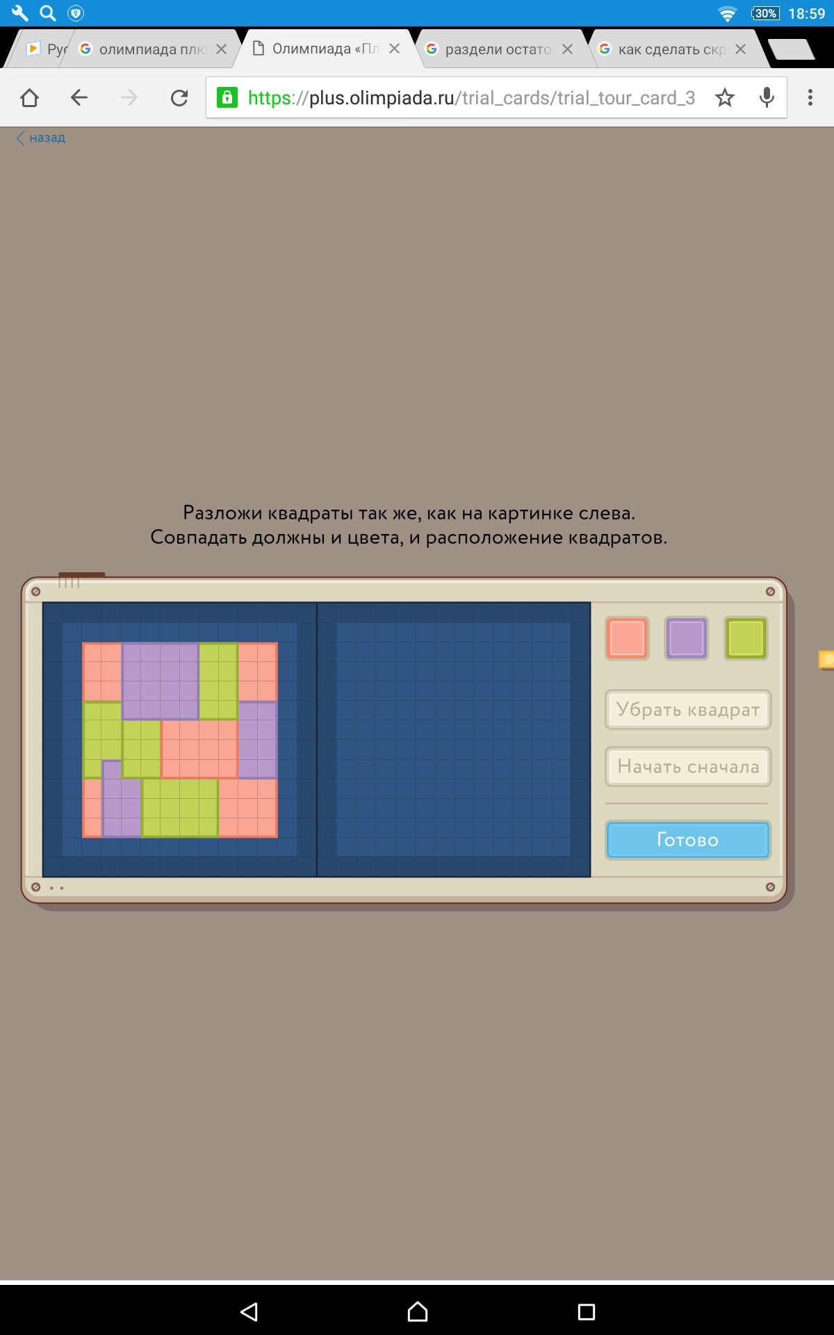 разложи квадраты так же, как на картинке.Совпадать и цвета, и расположение квадратов