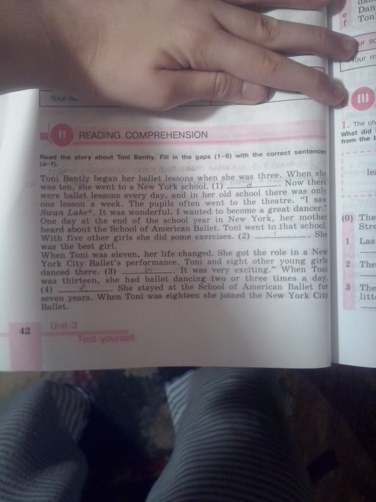 Когда Тони было одиннадцать лет, ее жизнь изменилась. Она получила роль в спектакле Нью-Йорке балетов. Тони и восемь других молодых девушек танцевали там. 3 «_________. Это было очень интересно ». Когда Тони было тринадцать лет, она была бальными танцами два или три раза в день. 4_______________. Она осталась в Школе американского балета в течение семи лет. Когда Тони было восемнадцать лет она вступила в Нью-Йорке «Это было фантастически. Но мой первый год было очень трудно. 5___________________. Тони посетил Лондон, Париж, Копенгаген и другие города. Но вскоре она решила оставить балет и начал путешествовать. Она пошла в Европу. 6____________. Теперь Тони Bently стал автором нескольких книг о знаменитых балерин. Сейчас Тони говорит «Балет изменил мою жизнь. Im рад, что я был балериной балета Нью-Йорка.