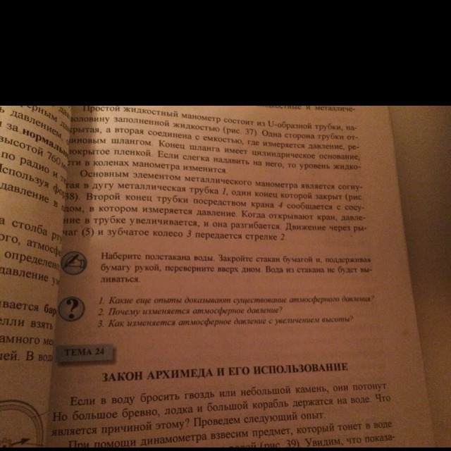 1.Положите на стол развёрнутую газету, под неё подсуньте линейку (сантиметров 40),чтобы её конец находился на 5-6 см за краем стола. Ударьте довольно сильно по выступающей линейке рукой. Линейка не упадёт, потому что тонкую газету на ней прижимает атмосферное давление. Без газеты линейка слетит сразу и по лбу вам дать может.