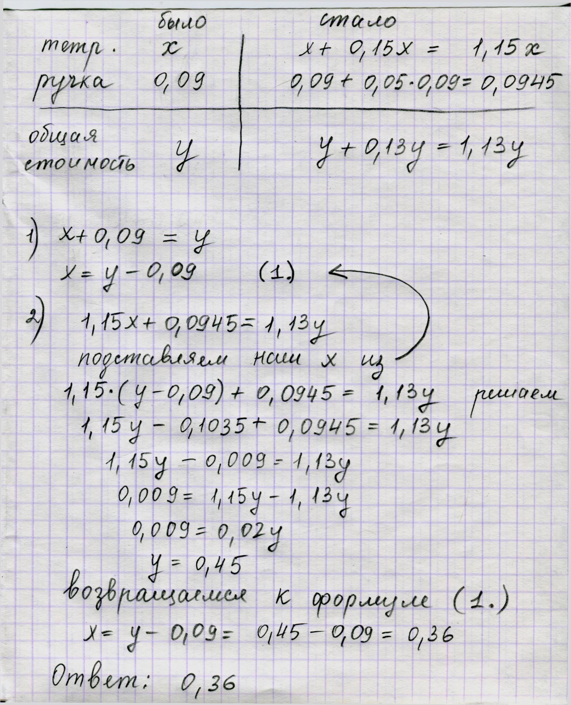 Забывчивый ученик покупает каждый день тетрадку и ручку. После того, как цена тетрадки выросла на 15%, а ручки на 5%, то суммарная стоимость покупки выросла на 13%. Найдите, сколько стоила тетрадка, если ручка стоила 0,09 руб.