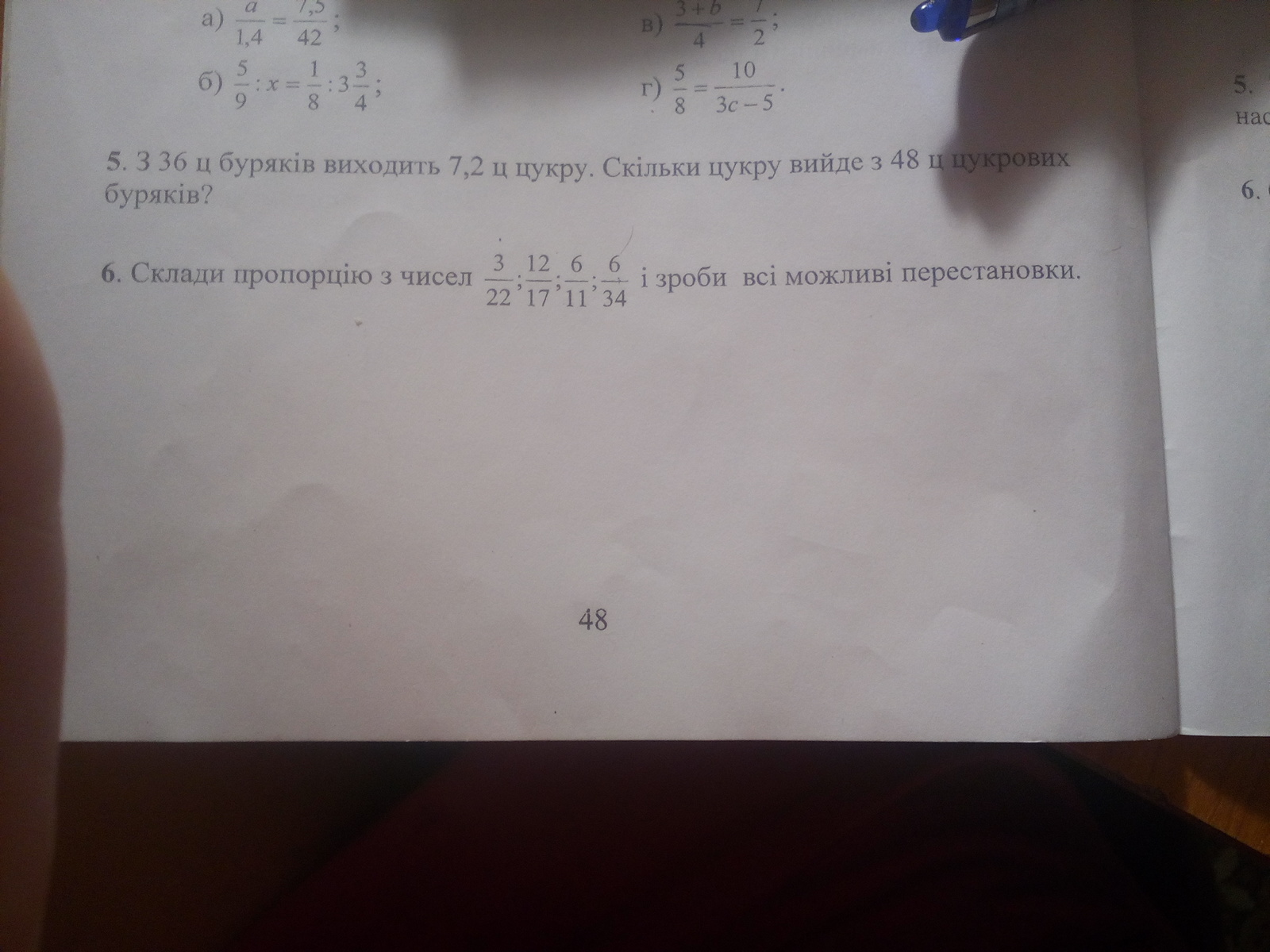 Склади пропорцію з чисел 3/22, 12/17,6/11,6/34 і зроби все можливі перестановки (/-це знак дробу "палочка") і зробіть 5 номер будь ласка