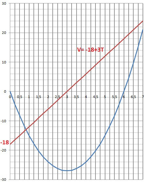 Первый двигался со скоростью - 18, но с ускорением 3Т и остановился и поехал в прямую сторону.