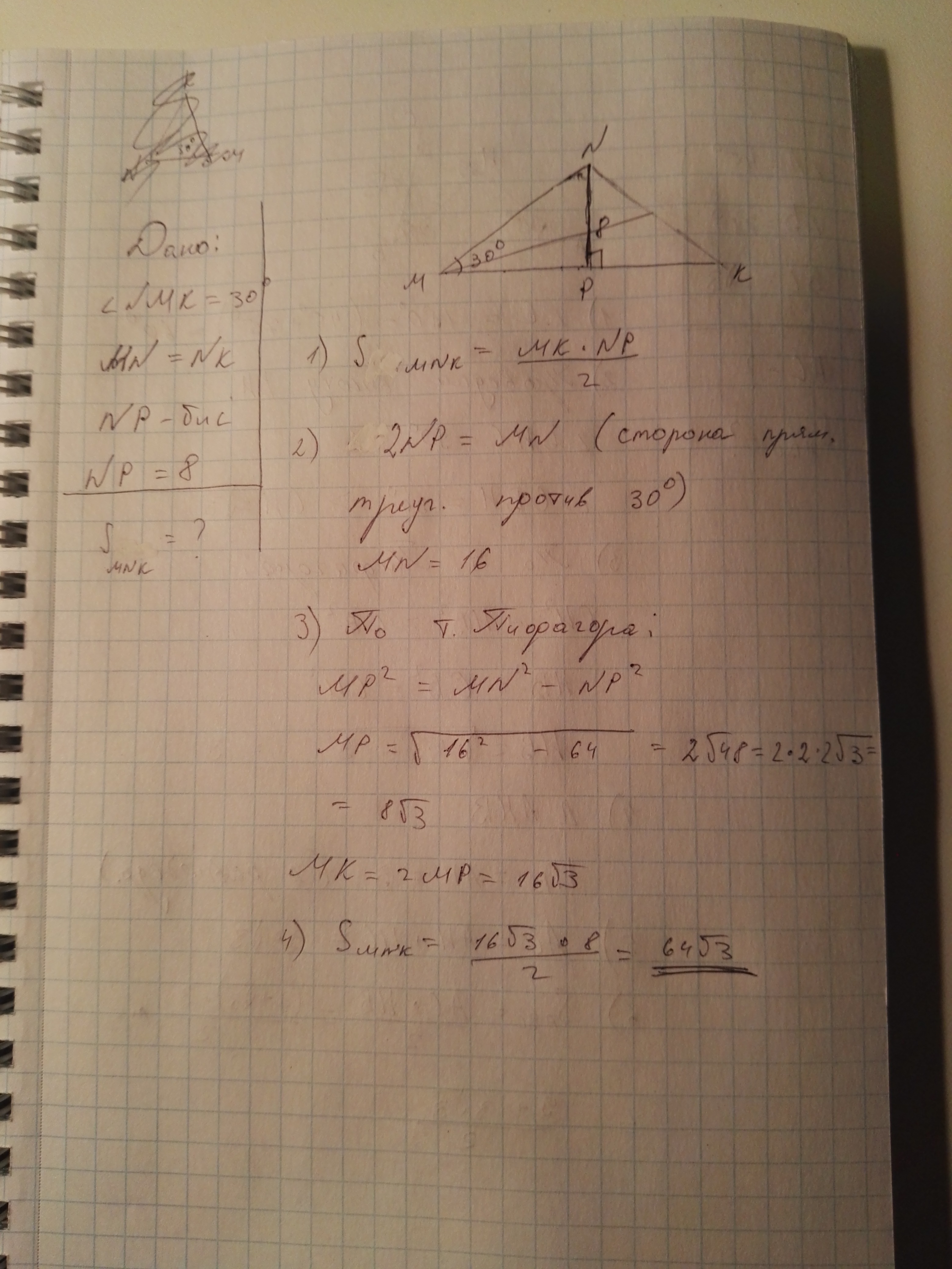 1) В треугольнике mnk :mn=nk , угол kmn =30 градусам , np =8 , mp - биссектриса
