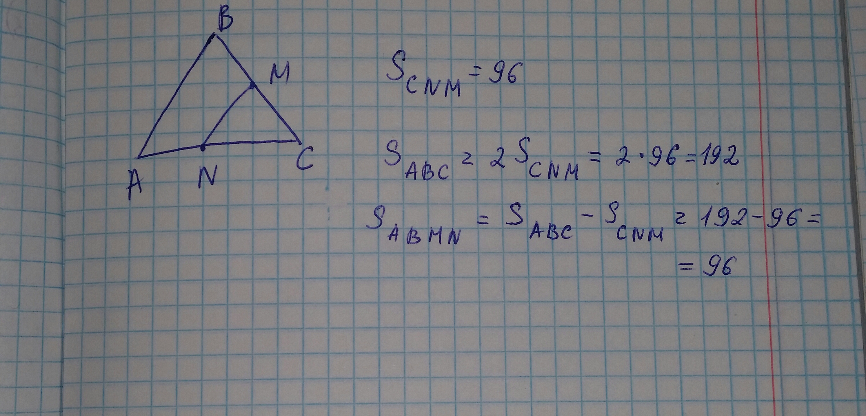 В треугольнике ABC отмечены середины M и N сторон BC и AC соответственно. Площадь треугольника CNM равна 96. Найдите площадь четырёхугольника ABMN.