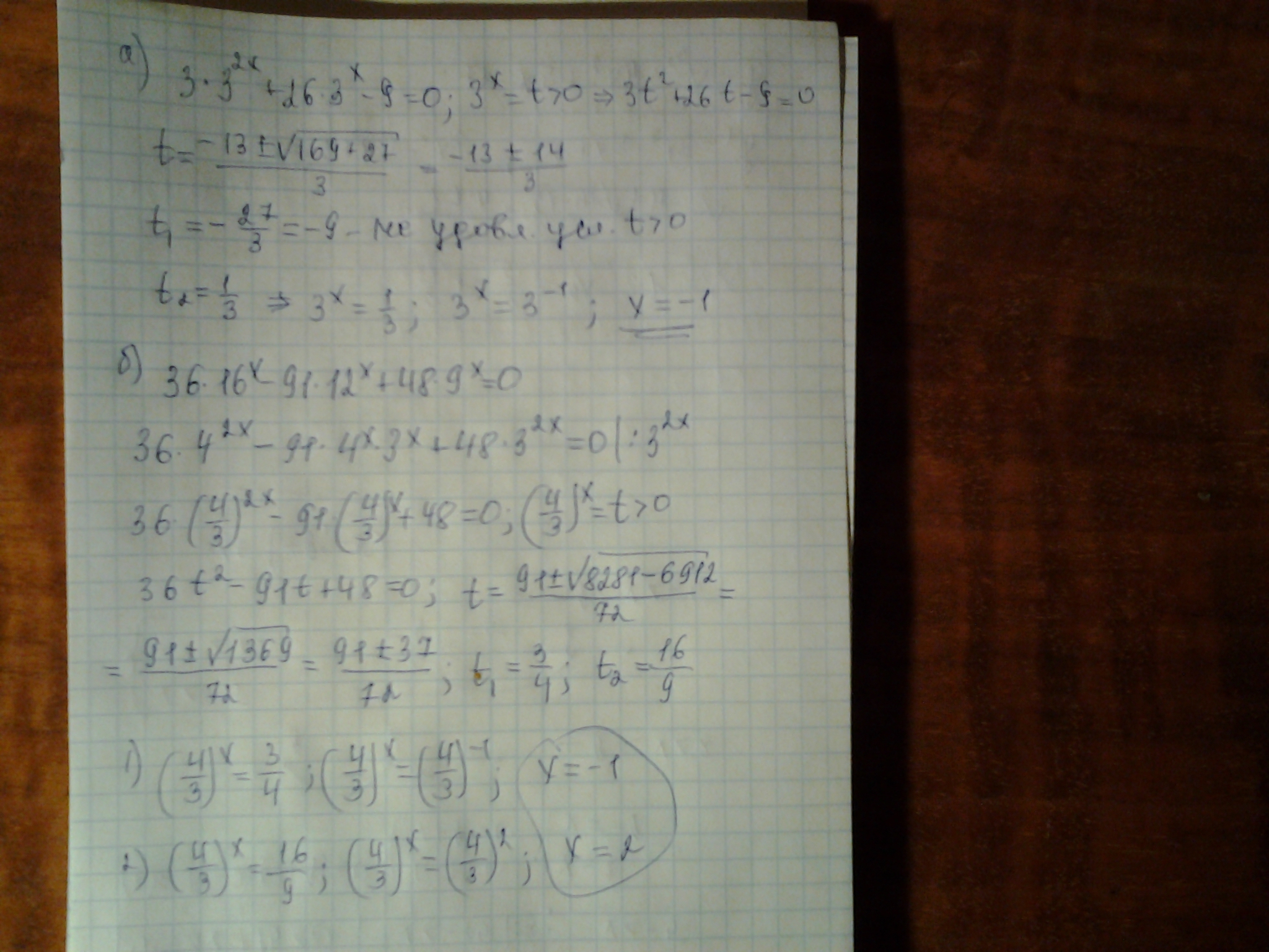 б) 36 * 16^x - 91 * 12^x + 48 * 9^x=0