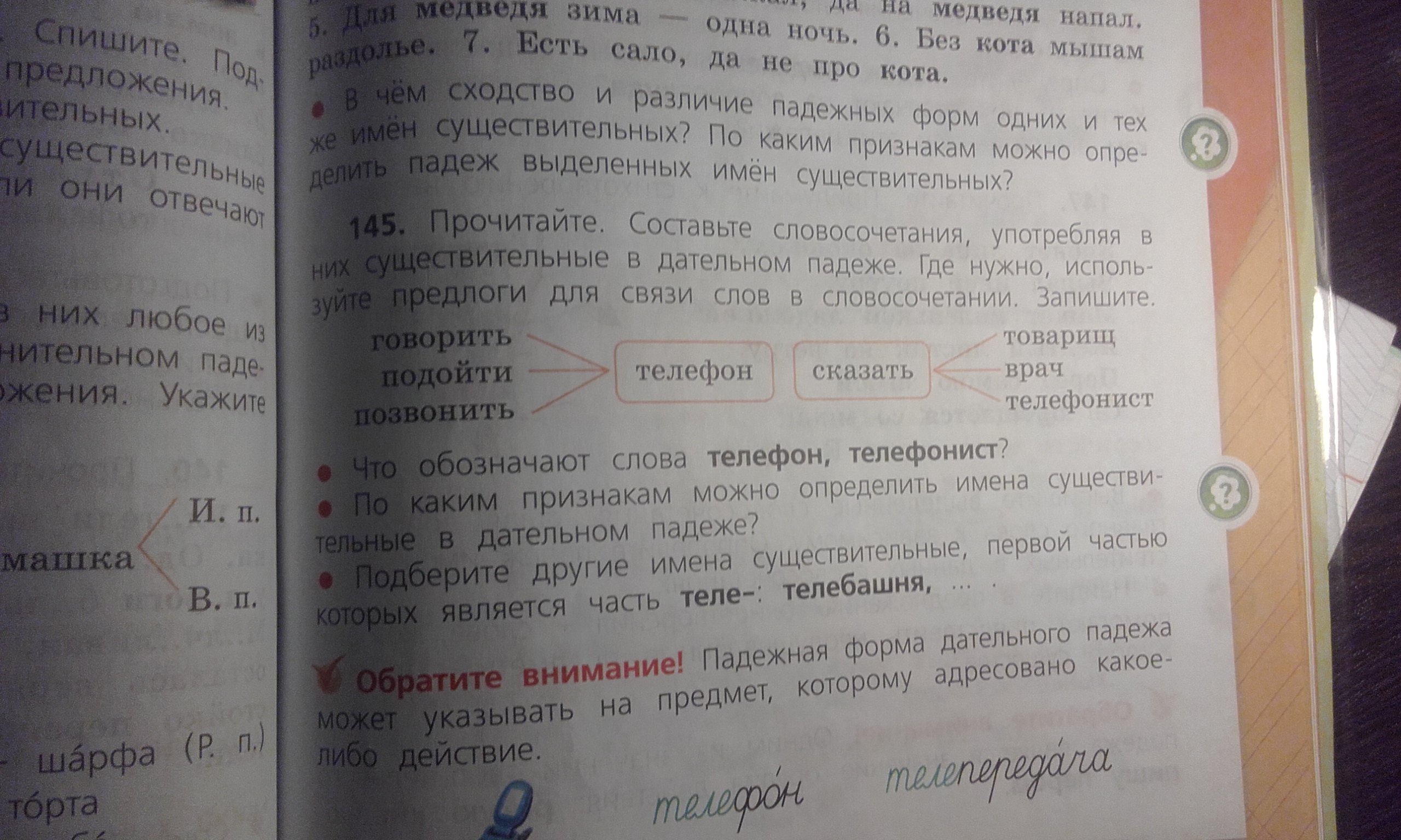Говорить по телефону, подойти к телефону, позвонить по телефону. Сказать товарищу, сказать врачу, сказать телефонисту. Дательный падеж (кому? Чему?)