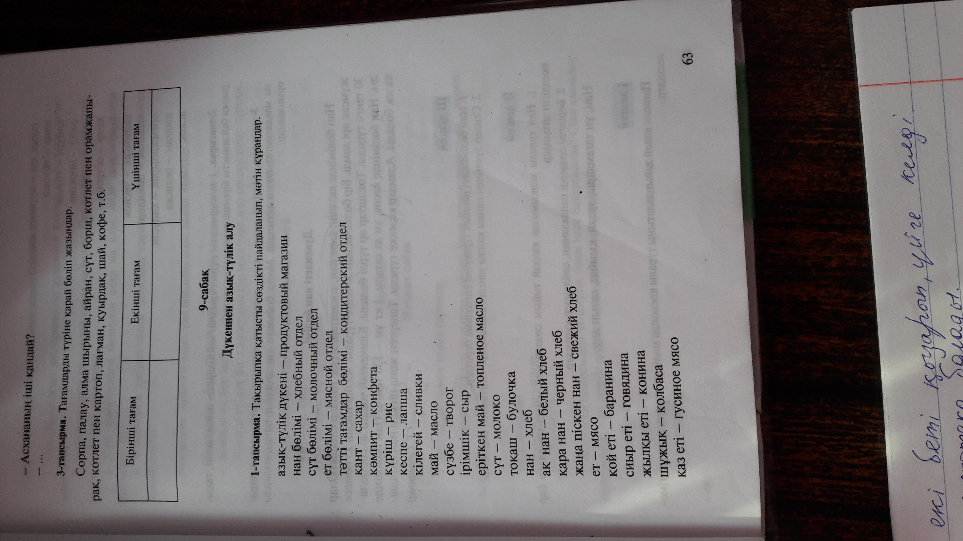 Кеше тағамдар алуға азық-түлік дүкеніне барғанмын. Нан бөліміне барып, үйге жаңа піскен нан мен токаш алдым, анам жейтін қара нанды да ұмытпадым. Кешкісін қонақ келетінін біліп, торт пен тәттілер алуға тәтті тағамдар бөліміне бардым. Тортка керекті қант, кілегей, май, сүзбе, сут алдым. Ыстық тағам керек екендігі уақытында есіме түсіп ет бөліміне бардым. Сиыр еті мен жылқы еті барынша кымбаттаган. Кой еті мен шұжық алдым. Дүкеннен шығып келе жатқанда көкөністер мен дастарқанға коятын салаттар, тіске басарлар есіме түсті. Жолдан шағын супермаркетке соғып, кәмпит, ірімшік, алма алмұртпен қатар салатка қажетті көкөністер сәбіз, қияр, картоп, пияз бен қызанақ алдым. Өзіме риза болып, үйге кеттім.
