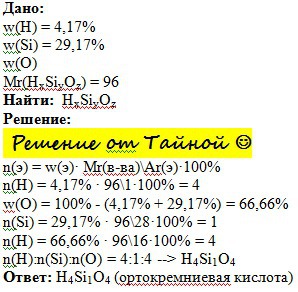 Определите простейшую химическую формулу, если массовые доли элементов: водорода 4,17%, кремния 29,17%, остальное – кислород. Mr(вещества)=96.