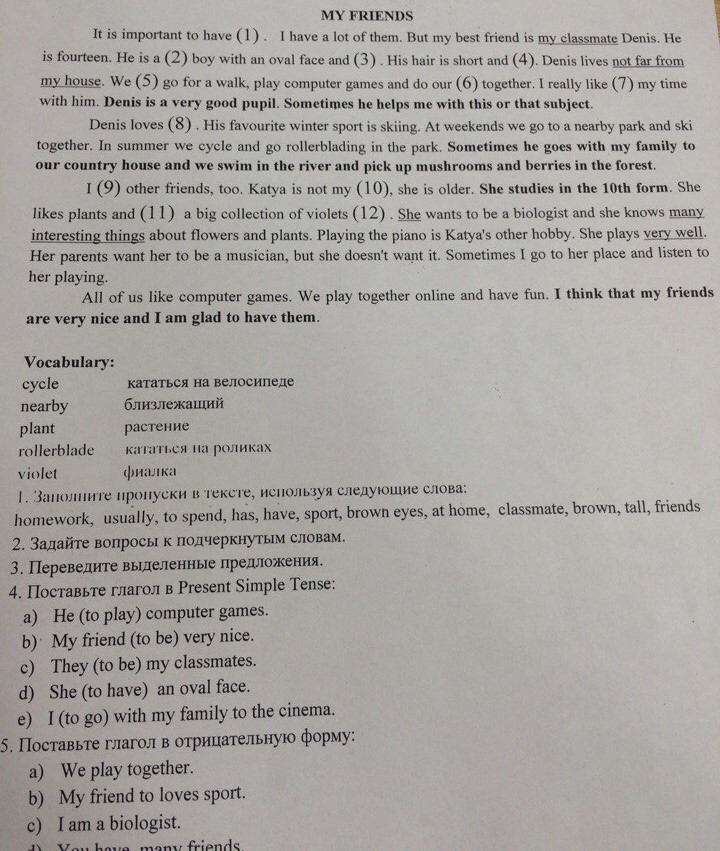 1.friends 2 . tall 3.brown eyes 4.brown 5.usually 6homework 7.to spend 8.sport 9.have 10. classmate 11 has 12.at home