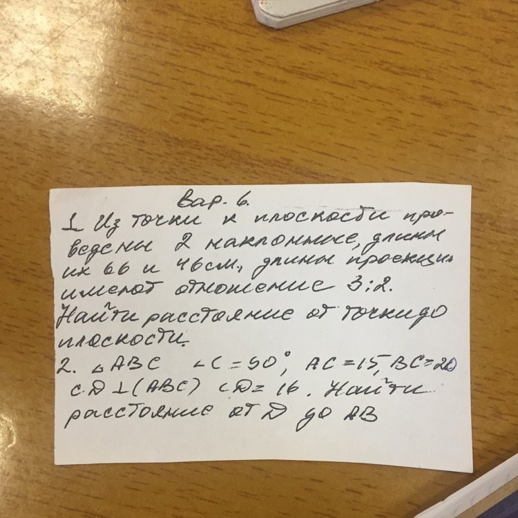 2)из точки к плоскости приведены 2 наклонные,длины их 66 и 46см длины проекций имеютот отношение 3:2. Найти расстояние от тоски до плоскости