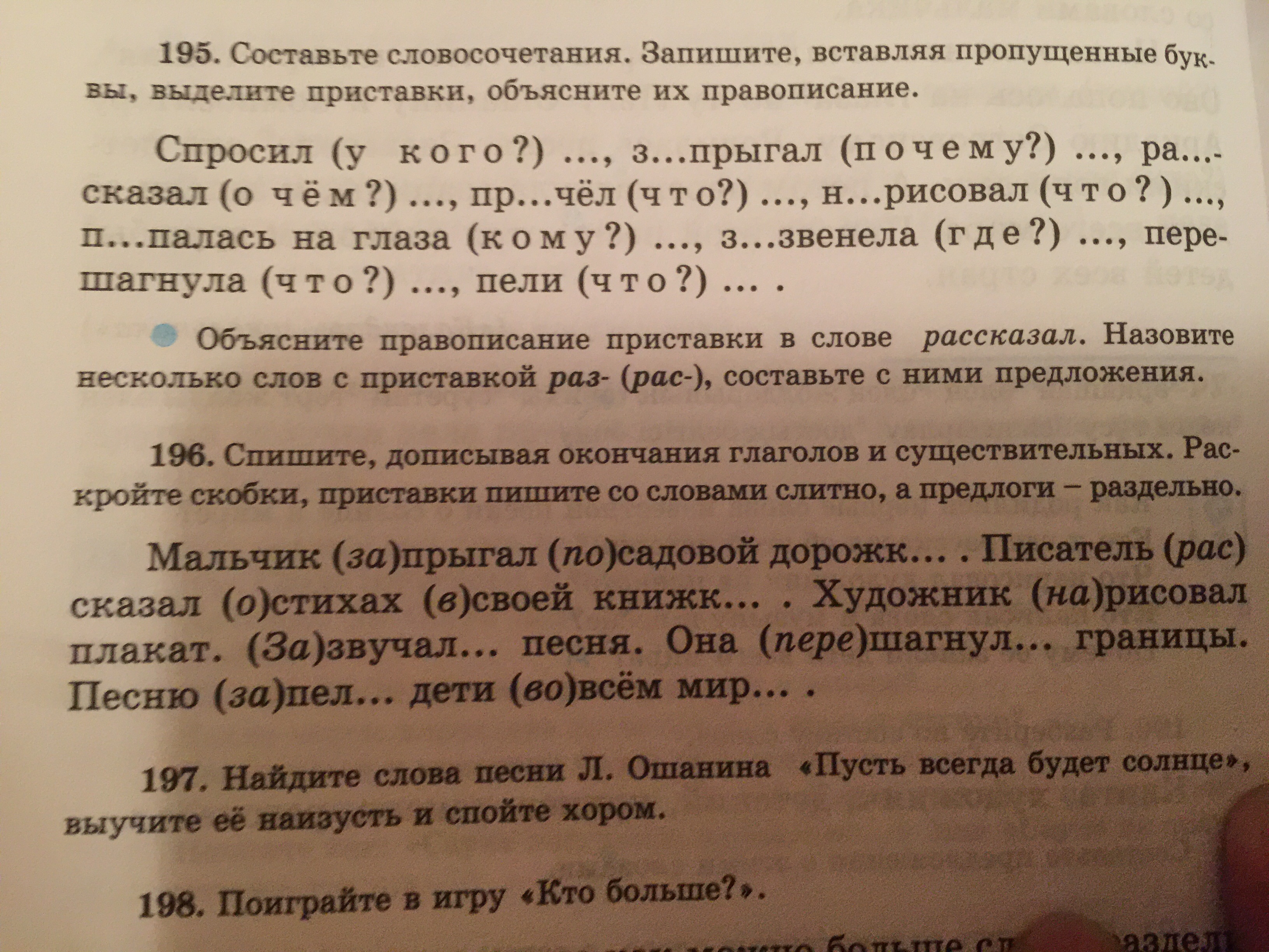 1 Спросил (у кого?) у мамы, запрыгал (почему?) от радости, рассказал (о чём?) о писателе, прочёл (что?) книгу, нарисовал (что?) картину, попалась на глаза (кому?) учителю, зазвенела (где?) в лесу, перешагнула (что?) порог, пели (что?) песню.