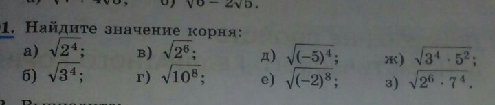 То число, что находится под корнем, возводишь в степень (умножаешь само на себя столько раз, сколько указано числом степени): а) 2⁴=2×2×2×2=16=√16=4²; б)√3⁴=√81=9²; в) √64=8²; г) √100000000=10000²; д) Если степень четная→минус уходит: √625=25²; е) √256=16²; ж) √81×25=√2025=45²; з) √64×2401=√153664=392²