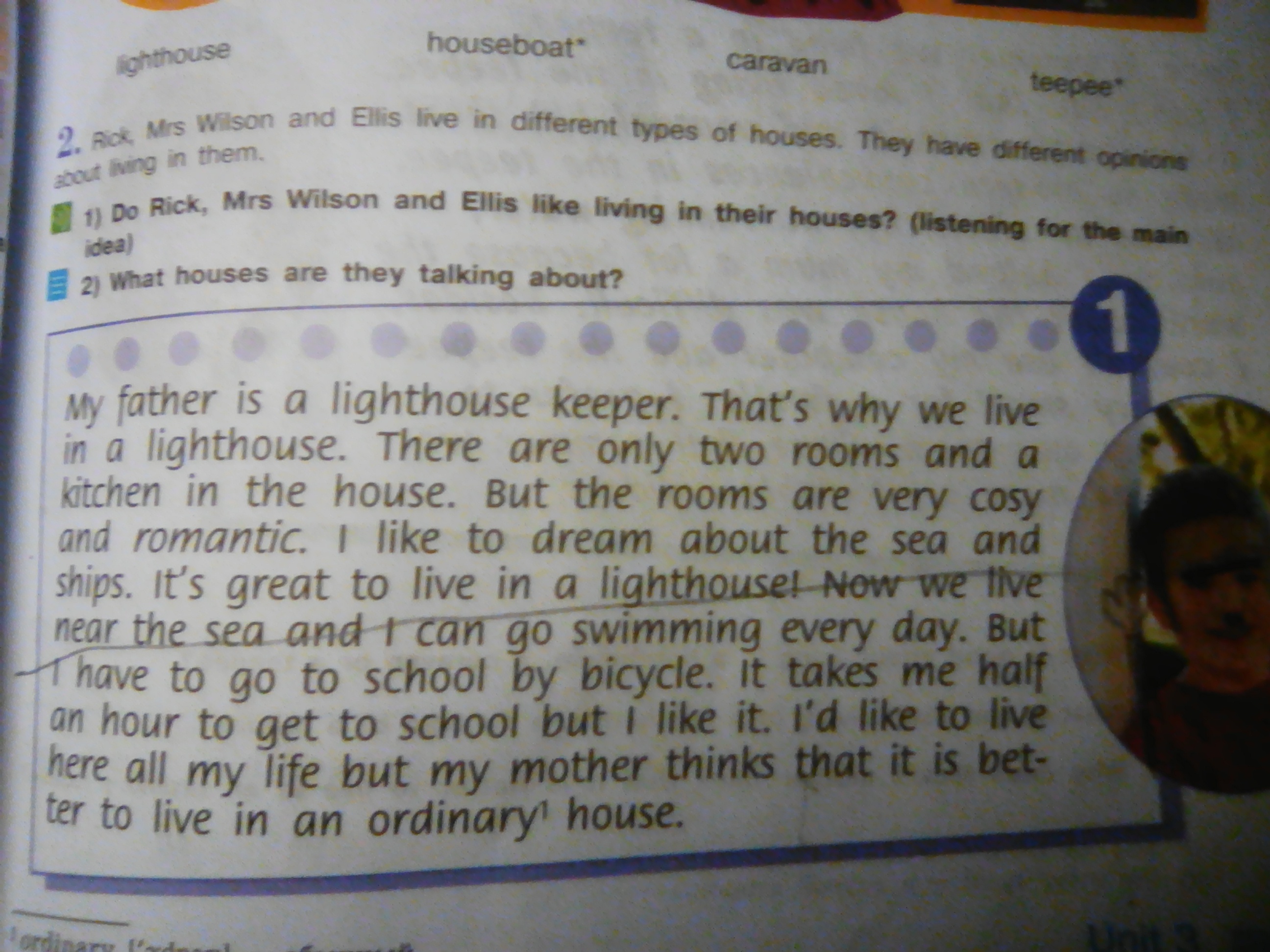 Мой отец хранитель маяка, потому мы в нём и живём. Там есть лишь две комнаты и кухня в доме. Эти комнатки очень уютны и романтично выглядят. Я люблю думать, мечтать о море, кораблях. Жизнь в маяке удивительна. Поскольку мы находимся у самого моря, то я могу плавать каждый день. Но вот в школу приходится добираться на велосипеде. Иногда это занимает полчаса, а иногда и час, но мне и это по нраву. Я хотела бы провести тут всю жизнь, но моя мама считает, что лучше уж в обычном доме.