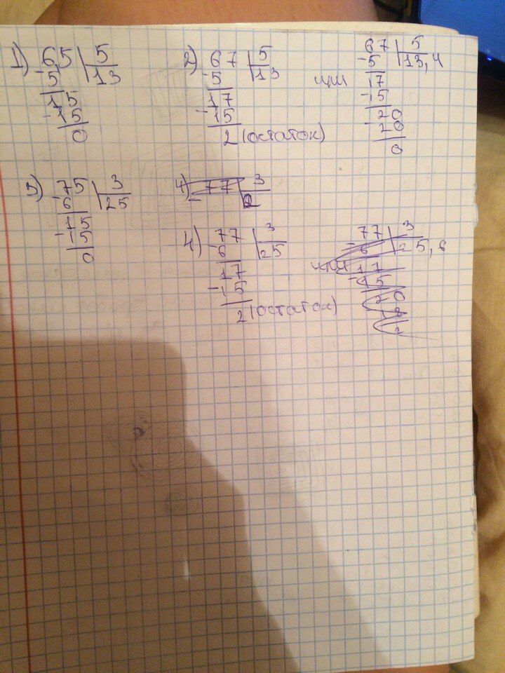 Выполни деление используя запись столбиком 65:5;67:5; 75:3;77:3 можете не писать спомощью каракуль просто скажите срава то-то слева...