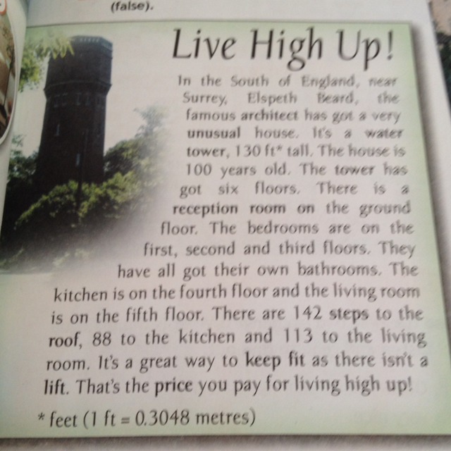 На юге Англии, недалеко от Сюррей, Элспет Борода, известный архитектор получил очень необычный дом, это водонапорная башня, 130 футов "высокий, дом 100 лет. Башня имеет шесть этажей. Существует прием номер на первом этаже номера расположены на первом, втором и третьем этажах. все они получили свои собственные ванные комнаты. кухня находится на четвертом этаже, а в гостиной находится на пятом этаже есть 142 ступеньки к крыше 88 до кухни и 113 в гостиной. это отличный способ поддерживать хорошую физическую форму, поскольку нет лифта. это цена, которую вы платите за живущих высоко!