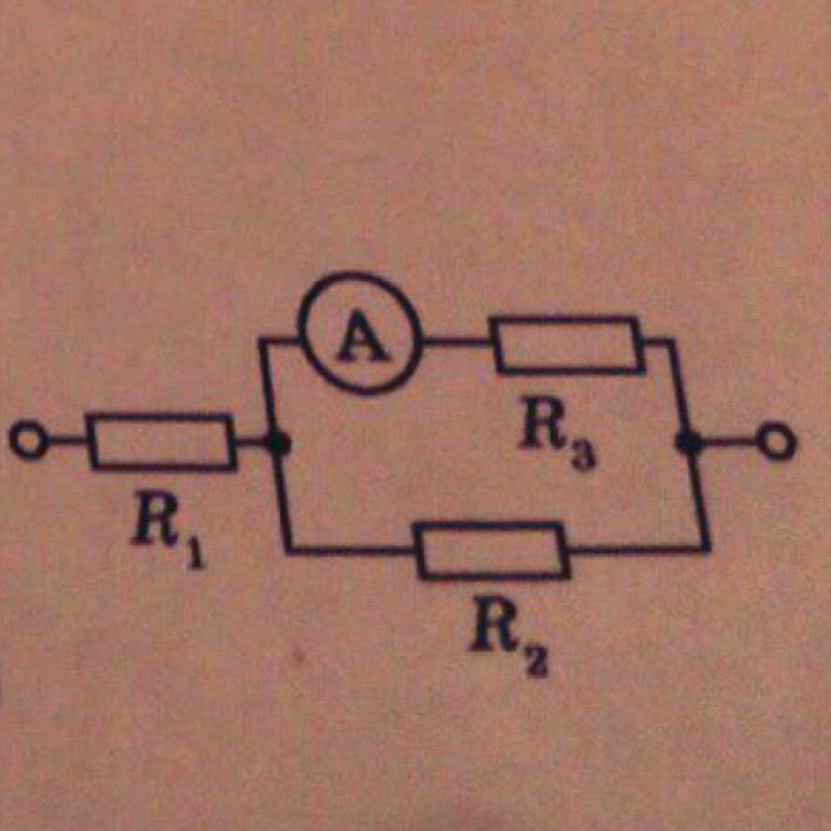 Знайдіть напругу подану на ділянку кола(мал.), якщо амперметр показує 3,0 А, а опір кожного резистора дорівнює 5,0 Ом.