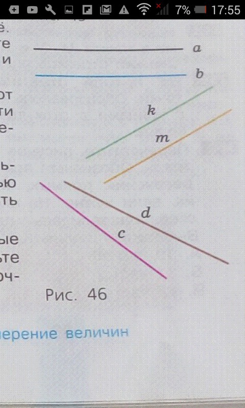 На рисунке 46 найдите параллельные прямые. Проверьте с помощью линейки и угольника справедливость ваших утверждений.