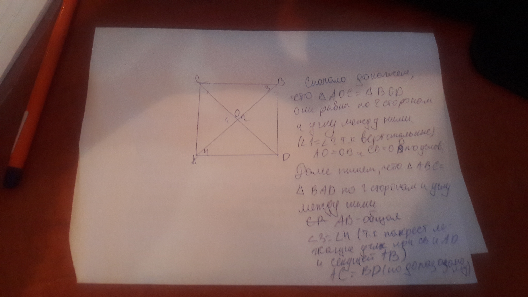 Отрезки AB и CD пересекаются в точке O и делятся точкой пересечения пополам.Докажите, что треугольник ABC=трейгольнику BAD.