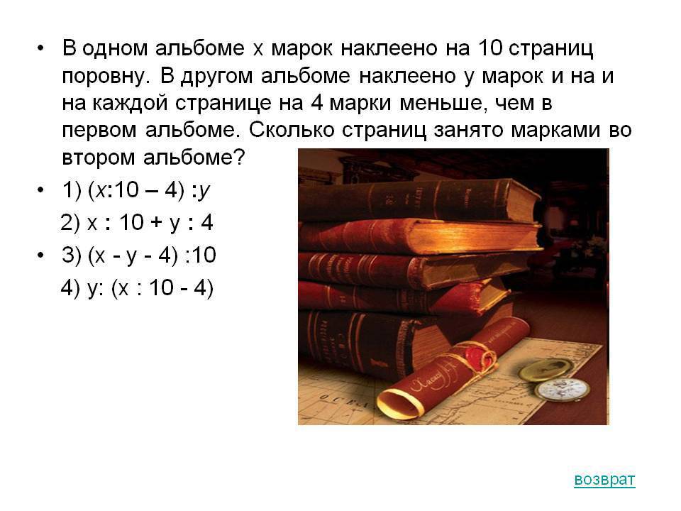 помогите решить задачу с решением:В одном альбоме х марок наклеена на 10 страницах поровну.Во втором альбоме наклеена y марок на 12 страницах