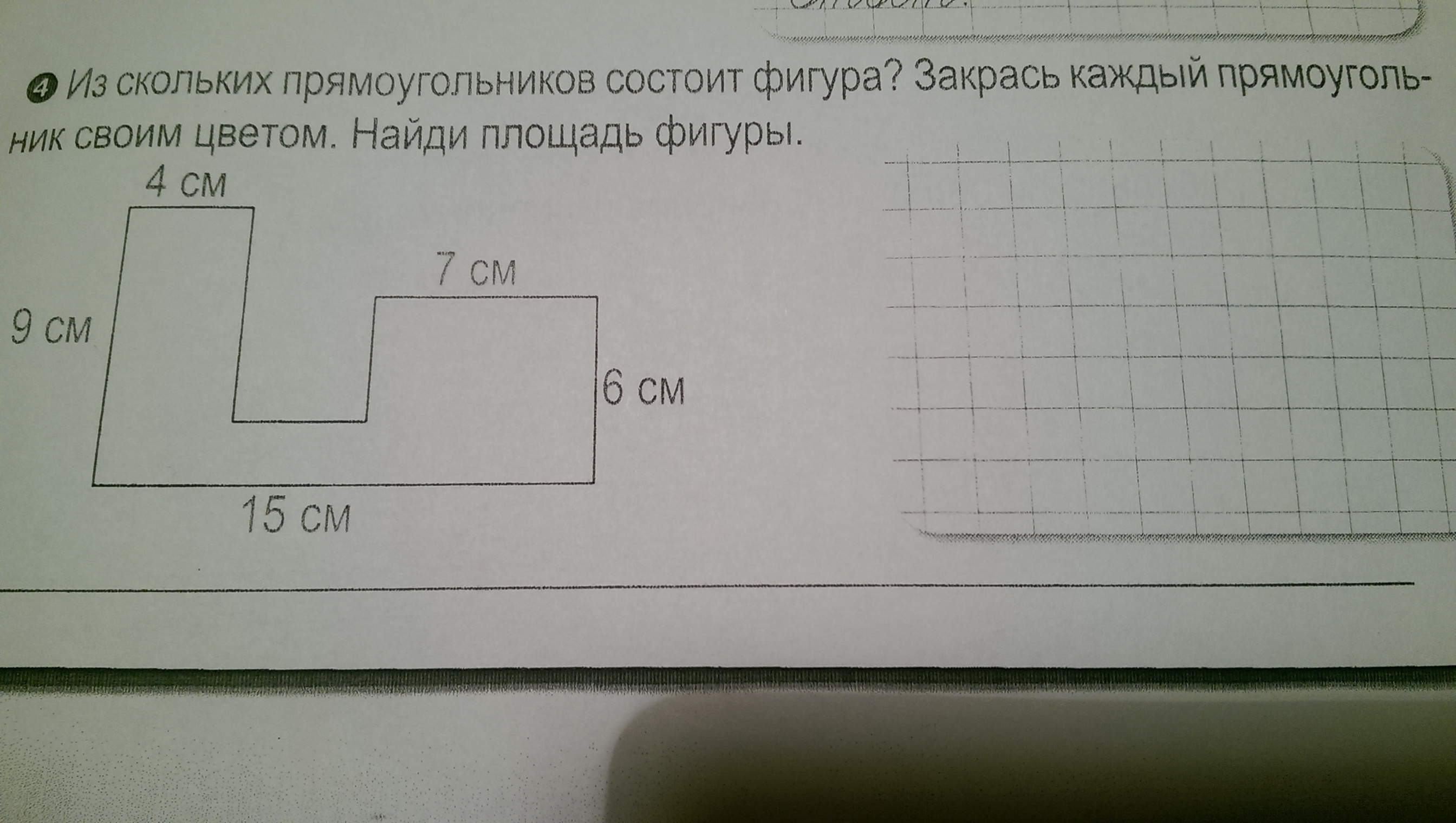 как решить задачу:из скольких прямоугольников состоит фигура?Закрась каждый прямоугольник своим цветом.Найди площадь фигуры.