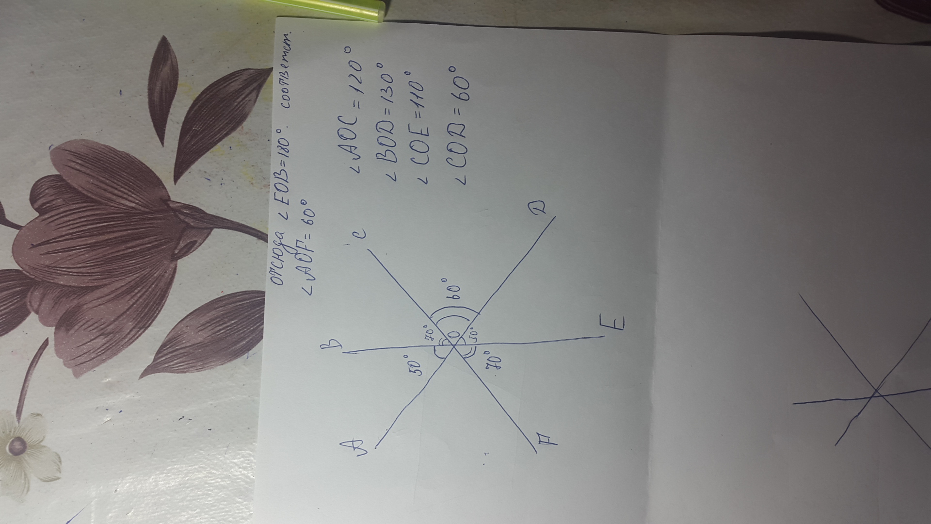 Там угол EOB=180° т. к. это прямая, а остальные углы находятся очень легко(смежные углы и вертикальные углы).