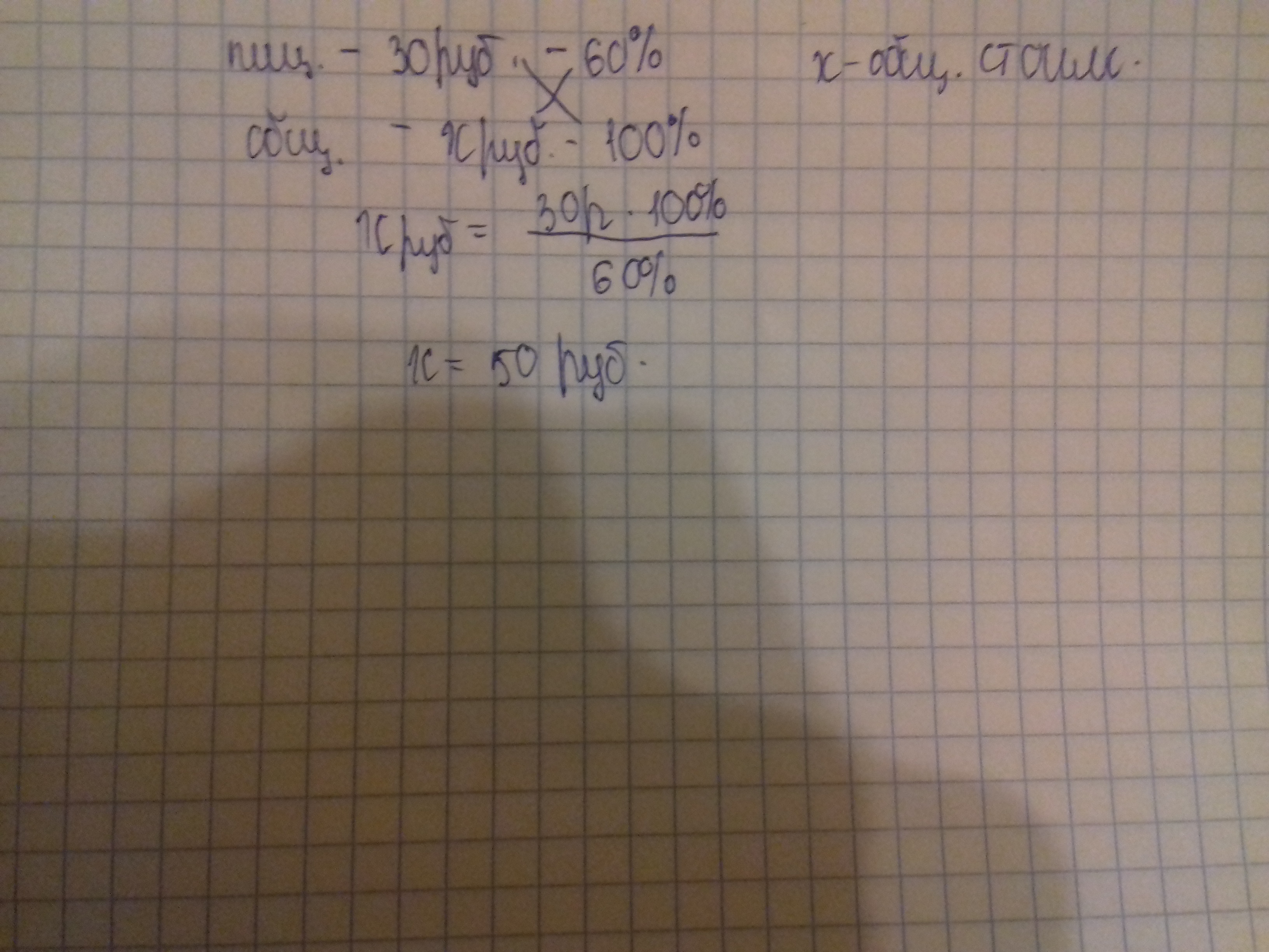 В буфете школьник купил пиццу и стакан сока.Известно,что пицца стоит 30 рублей,что составляет 60% от стоимости всей покупки.Сколько рублей школьник заплатил за пиццу и стакан сока вместе?