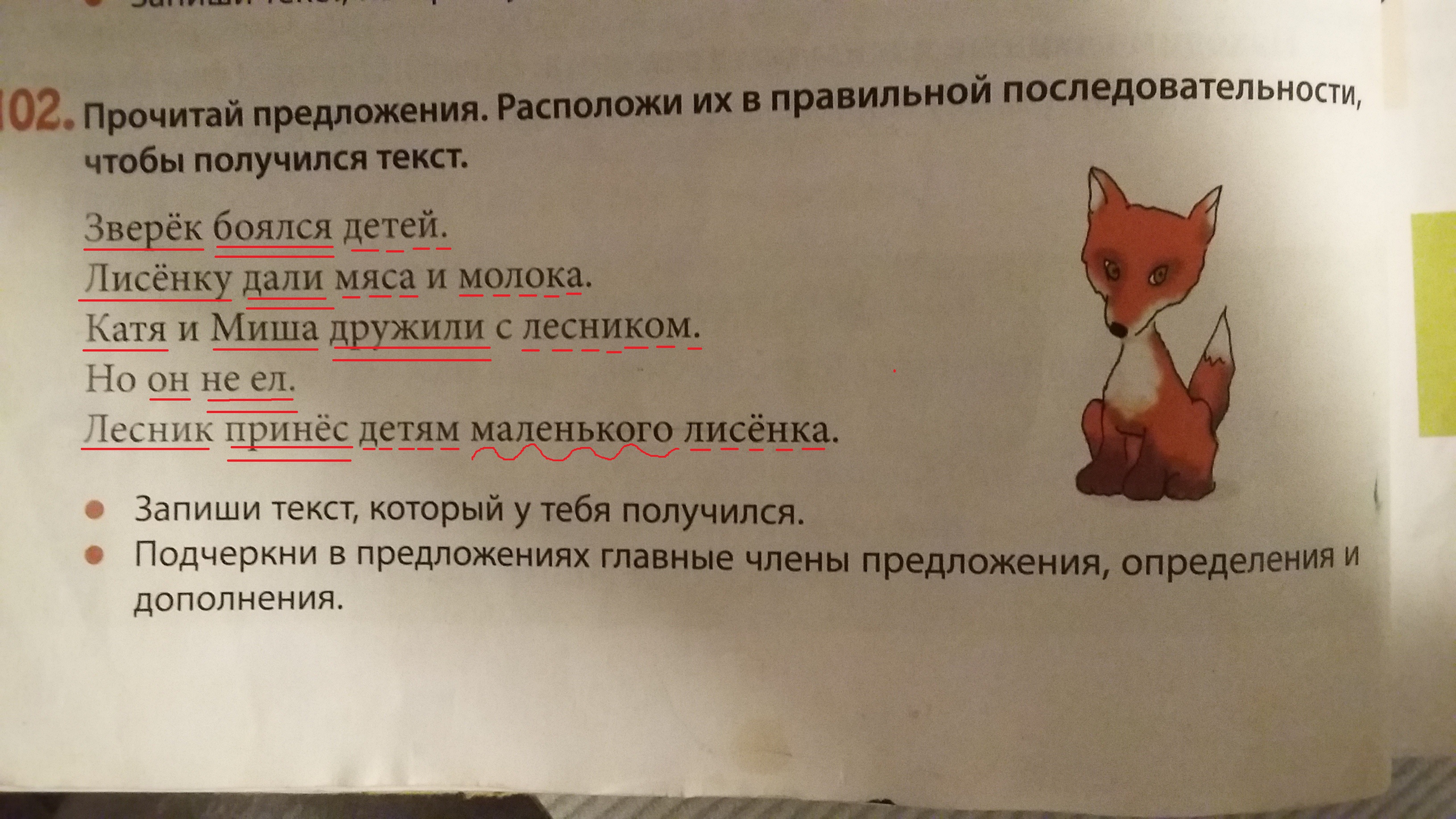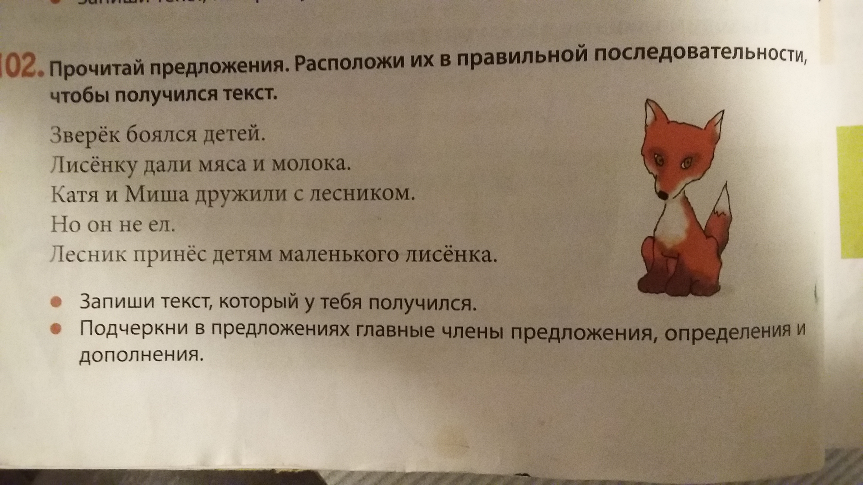 Лесник принес детям маленько лисенка. Лисенку дали мяса и молока. Но он не ел. Катя и Миша дружили с лисенком. Зверек боялся детей.