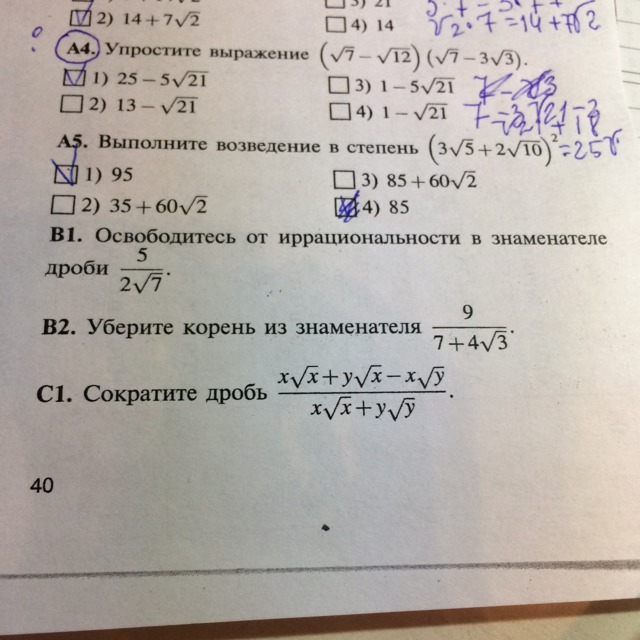 В2 9/7+4корней из 3=9 (7-4кор из 3)/(7+4кор из 3)(7-4кор из 3)=63-36кор из 3/49-16*3=63-36кор из 3/1
