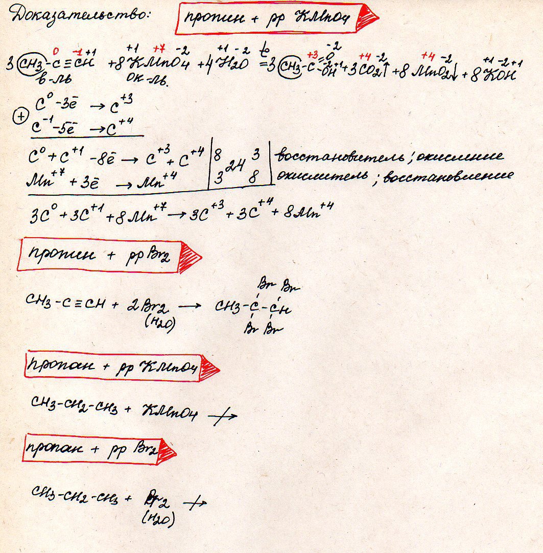 С помощью раствора перманганата калия и бромной воды можно распознать Пропин и Пропан, так как:
