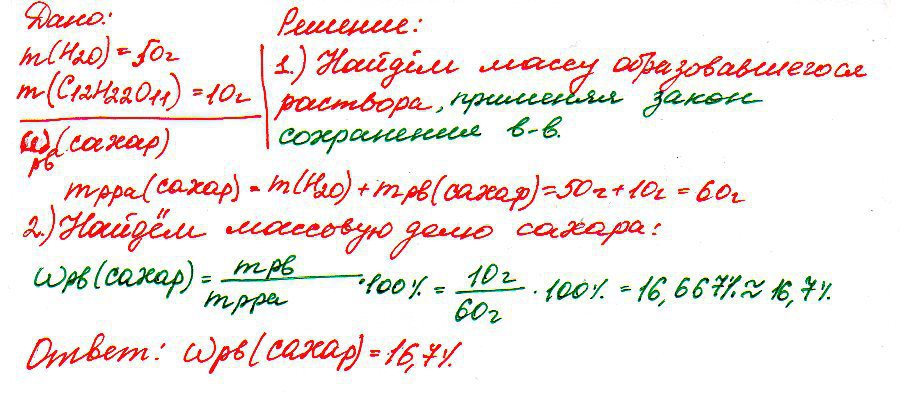 в воде массой 50 г растворили сахар массой 10г какова массовая дрля сахара в полученном растворе