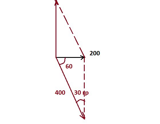 Снаряд массой 2 кг движущийся со скоростью 100м/c разрывается на два равных осколка. Первый летит в направлении перпендикулярно первоначальному, второй - со скоростью 400м/c. Определить под каким углом к первоначальному направлению отлетает второй осколок.
