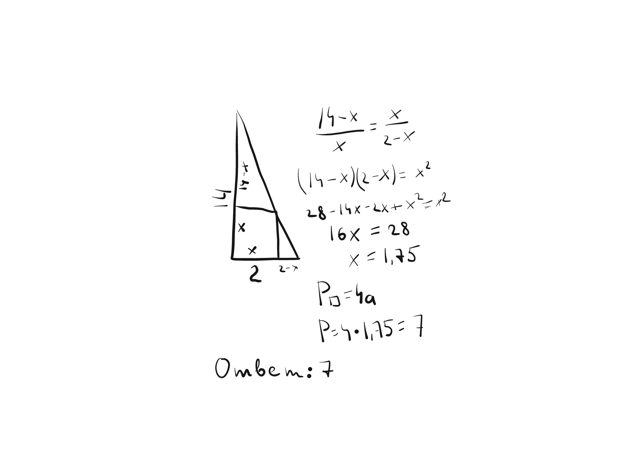 в прямоугольном треугольнике вписан квадрат, имеющий с ним общий прямой угол. Найдите периметр квадрата, если катеты треугольника 2 и 14
