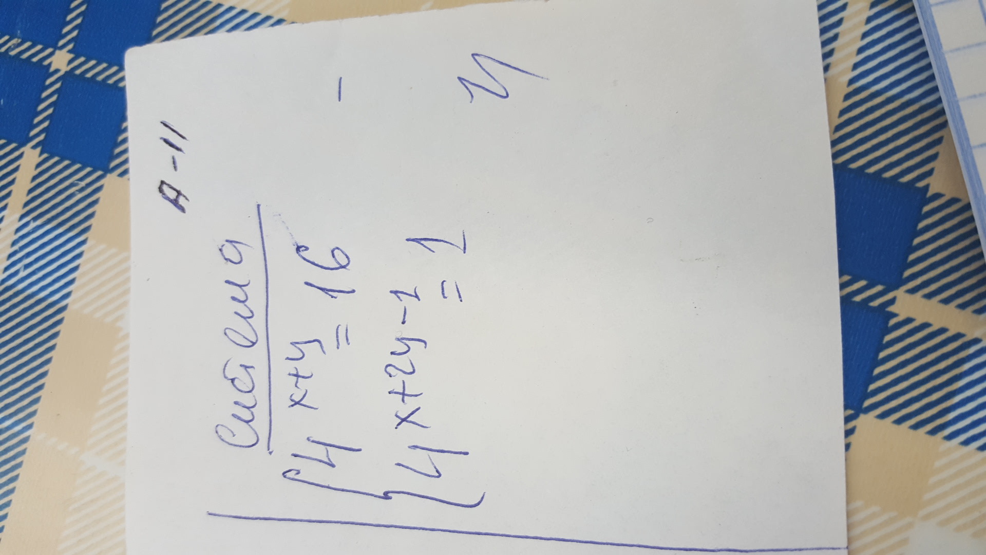 begin{cases}4^{x+y}=16\4^{x+2y-1}=1end{cases}Rightarrowbegin{cases}4^{x+y}=4^2\4^{x+2y-1}=4^0end{cases}Rightarrowbegin{cases}x+y=2\x+2y-1=0end{cases}Rightarrow\Rightarrowbegin{cases}x=2-y\2-y+2y-1=0end{cases}\2-y+2y-1=0\1+y=0\y=-1\begin{cases}x=3\y=-1end{cases}