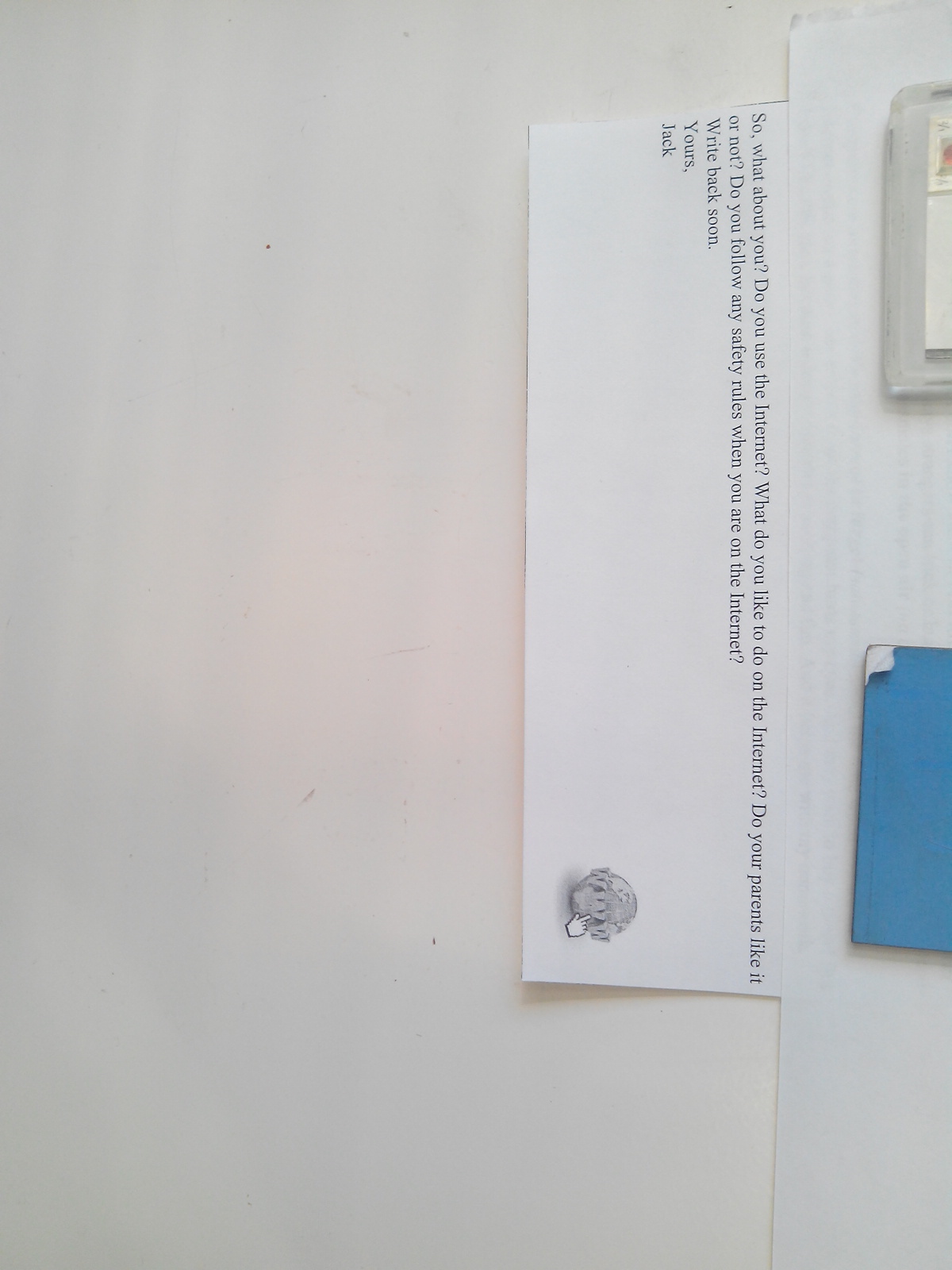 Так, что насчет тебя? Пользуешься ли ты интернетом? Что ты любишь делать в интернете? Твои родители одобряют это или нет? Следуешь ли ты каким нибудь правилам безопасности когда ты пользуешься интернетом?