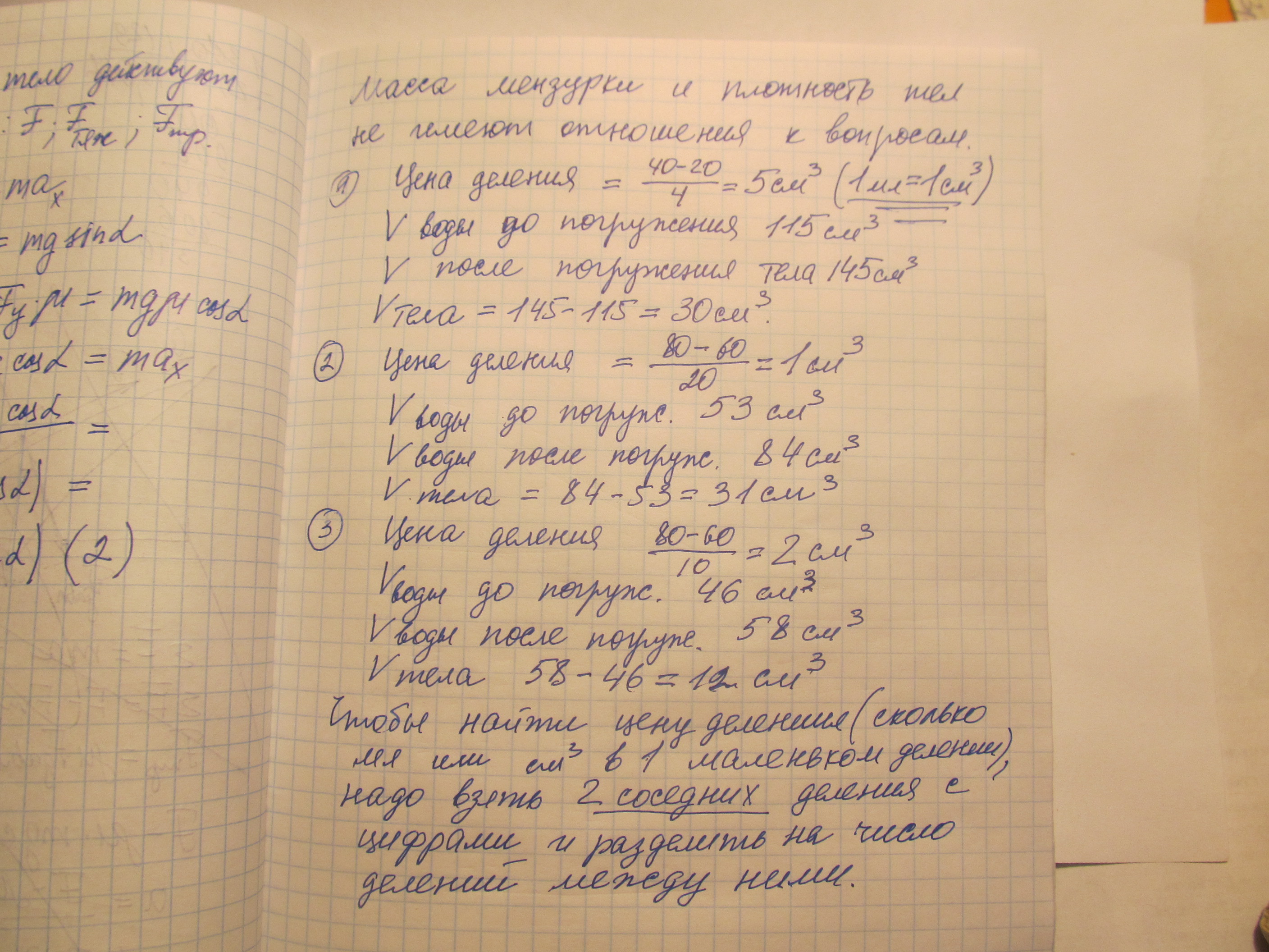 пожалуйста помогите. Определите цену деления измерительного цилиндра, объем жидкости до погружения тела, объем тела после погружения тела и объем погруженного тела.