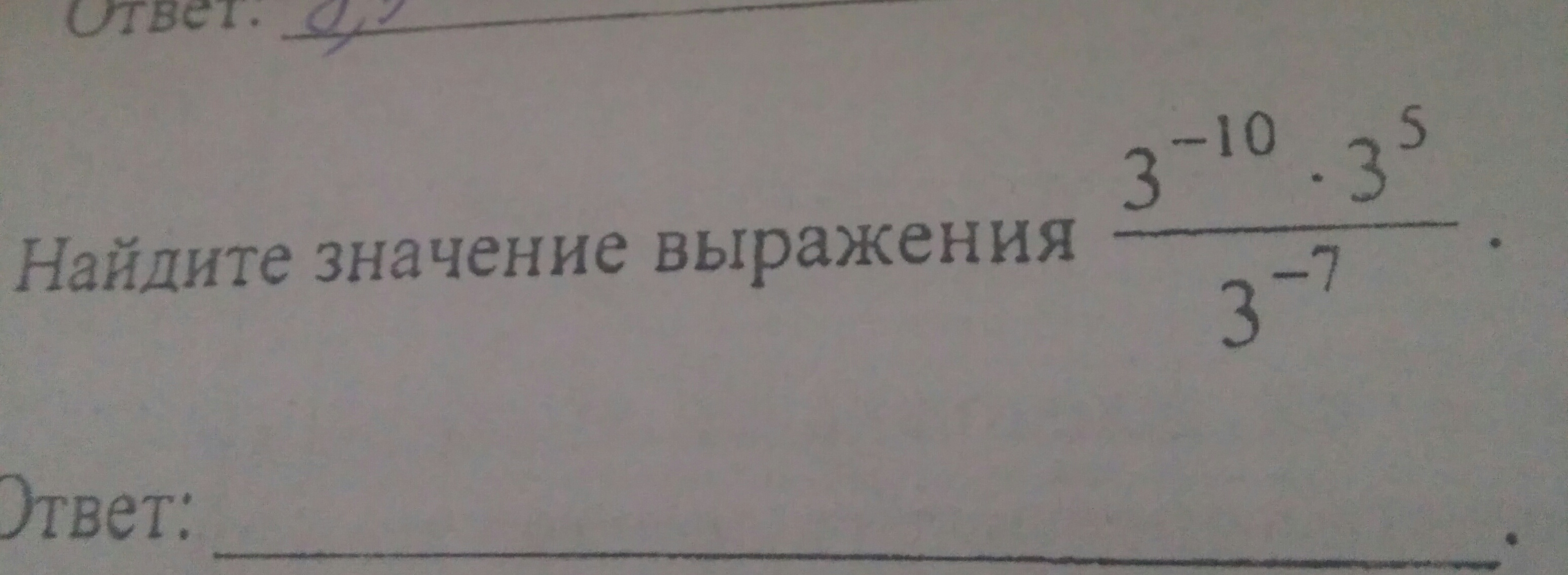 (3^-10*3^5)/3^-7 = 3^-5/3^-7 = 3^7/3^5 = 3^2 = 9