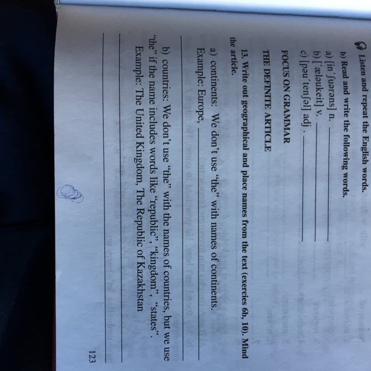 Это задание без текста не выполнить. В задании даны инструкции. Выписать надо названия стран из текста. Грамматическая составляющая такова: названия континентов и стран пишутся без артикля! (Russia, Bulgaria). C артиклем пишется названия стран, в которые включены слова "республика, королевство, штаты" (The USA, The United Kingdom)/ Это не сложно, попробуйте сами выбрать такие слова из текста и написать их в две разные колонки.