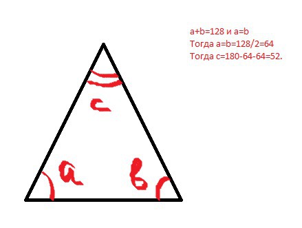 сумма углов при основании равнобедренного треугольника равна 128 градусов Найдите углы треугольника